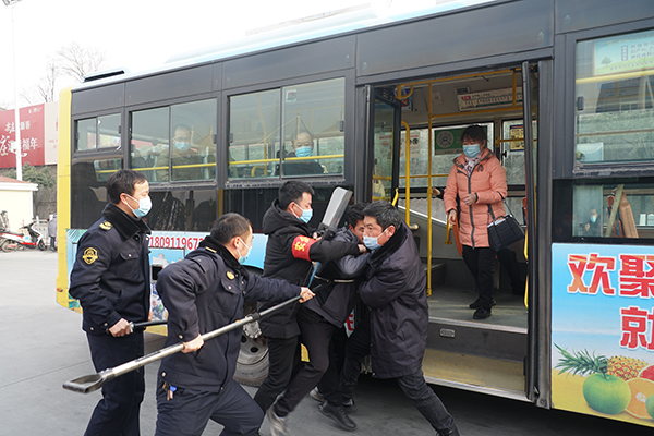 在火車站首末站,恰逢一車隊(duì)工作人員正在開(kāi)展疫情防控應(yīng)急演練,一未佩戴口罩的乘客欲乘車,駕駛員制止后,該乘客非但不聽(tīng),強(qiáng)行上車后辱罵、持刀相向駕駛員,駕駛員隨即將情況報(bào)告車隊(duì)長(zhǎng)并報(bào)警,車隊(duì)安保人員將其制服。看完演練后,熊衛(wèi)軍、錢萬(wàn)輝對(duì)工作人員面對(duì)突發(fā)事件的應(yīng)急處置能力點(diǎn)贊。